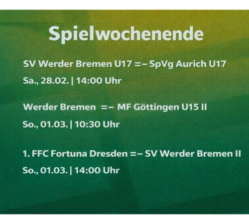 Die Ticketinformationen für die Auswärtsspiele der WERDERFRAUEN in Hoffenheim und Hamburg sind veröffentlicht. Die Spiele finden am 1. Februar 2026 in Hoffenheim und am 21. Februar 2026 in Hamburg statt. Tickets können ab dem 23. Januar 2026, 10:00 Uhr, für das Spiel gegen den HSV gekauft werden. Der VVK für das erste Heimspiel 2026 und das erste Auswärtssieg in Hoffenheim ist gestartet. Tickets für das Heimspiel gegen Wolfsburg am 07.02. um 12:00 Uhr seit 19.01. online im VVK.