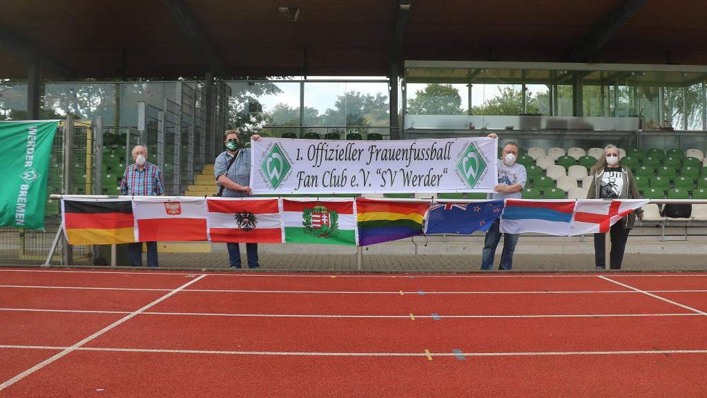 Es ist schon ein wenig komisch. Da spielen die Werder-Frauen auf Platz 11 und wir können nicht dabei sein. So geht es sicherlich auch vielen anderen Anhängern ähnlich wie uns. Als leidenschaftliche Fans, die wir nun mal sind, haben wir uns gefragt, welche Wege und Möglichkeiten haben wir um der Mannschaft unsere Unterstützung zukommen zu lassen. Dabei haben wir uns entschieden, einmal vor dem ersten Heimspiel unseren Banner, die grün-weiße Werder-Flagge und unsern neuen Banner da aufzuhängen, wo er bei den Spielen mit Fans auch hängen würde. Gut, der Banner würde neben den Fahnen hängen, wir mussten da ein wenig improvisieren. Der neue Banner ist die Verbindung einzelner Nationalflaggen unserer Spielerinnen der Ersten. Dabei haben wir nicht nur die aktuellen Nationalitäten berücksichtigt, sondern auch die die familiäre Herkunft. Zusätzlich in der Mitte haben wir noch die sogenannte Regenbogenflagge platziert, als Zeichen für Toleranz und Gleichberechtigung und gegen Ausgrenzung jeglicher Art. Dieses ist uns ein besonderes Anliegen, denn egal welche Nationalität, Rasse oder Sexualität, egal ob Beeinträchtigung oder „ohne“ – MENSCH IST MENSCH UND HAT DIE GLEICHEN RECHTE auf diesem Planeten zu sein —> RESPEKT
