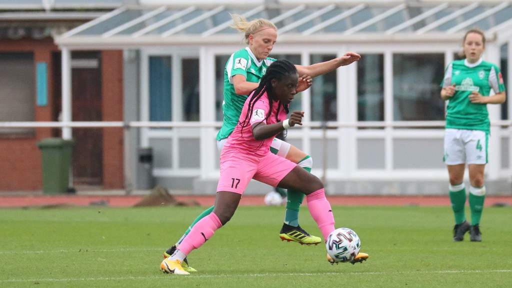 Die Gäste aus Essen begannen druckvoll und gingen bereits in der 4. Minute durch Baijings in Führung. Bereits zuvor hatten die Essenerinnen eine dicke Chance, diese jedoch aus kurzer Distanz den Ball am Tor vorbeischießt, nach dem Pauels nach einer Ecke nicht richtig an den Ball kam. Nach dem frühen Rückstand versuchte Werder nach vorne zu spielen, kamen jedoch nicht durch und die Essenerinnen blieben über Konter jederzeit gefährlich. Pech hatte Werder, als ein Freistoß von Lina Hausicke ins Strafraum flog, Goddard und Essens Keeperinnen hochsprangen, dabei der Ball durch ging und nur knapp das Tor verfehlte. Kurz vor der Pause hatte Anyomi noch die Möglichkeit für die Gäste zu erhöhen, nach dem der Ball von Werders Abwehr nicht richtig geklärt werden konnte, jedoch nicht ins Tor traf. Mit einem 0:1 Rückstand ging es für die Grün-Weißen in die Pause.