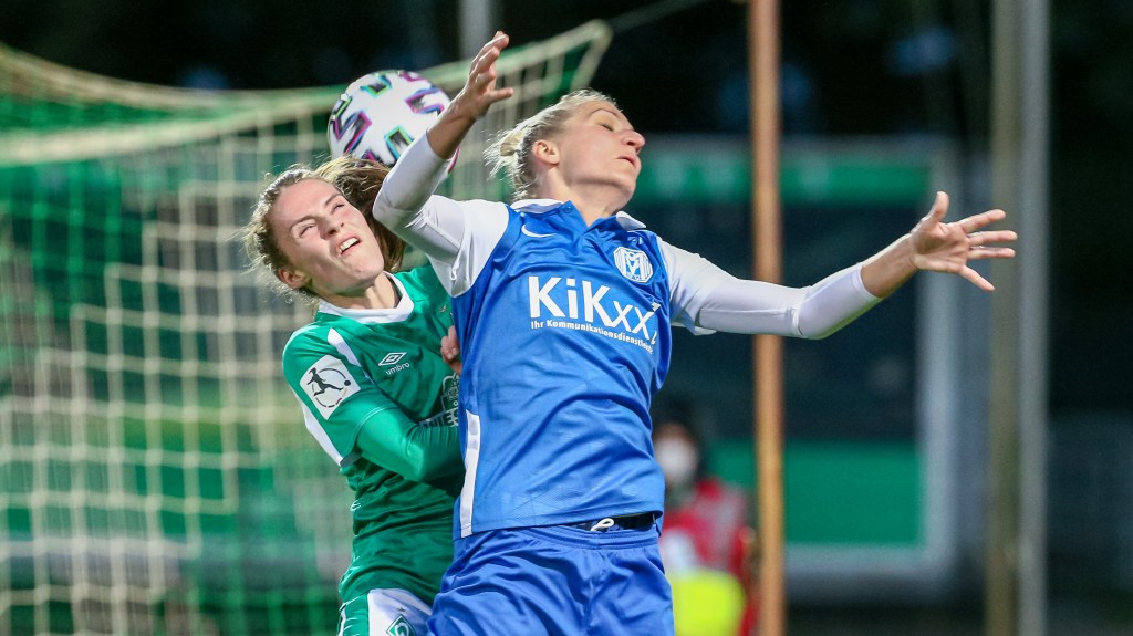 v.li.: Reena Wichmann (SV Werder Bremen, 6) und Agnieszka Winczo (SV Meppen, 15) im Kopfballduell (Foto: Oliver Baumgart) -