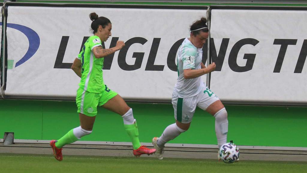Ein schönes Bild zu Beginn der Partie. Stephanie Goddard trug in ihrem letzten Spiel die Kapitänsbinde der Werder-Frauen und traf sich zur Seitenwahl mit Lena Goeßling, die zu ihrem letztes Spiel für den VFL Wolfsburg die Kapitänsbinde der Wölfinnen trug. Zwei Legenden der jeweiligen Teams wurde diese Ehre gebührt.