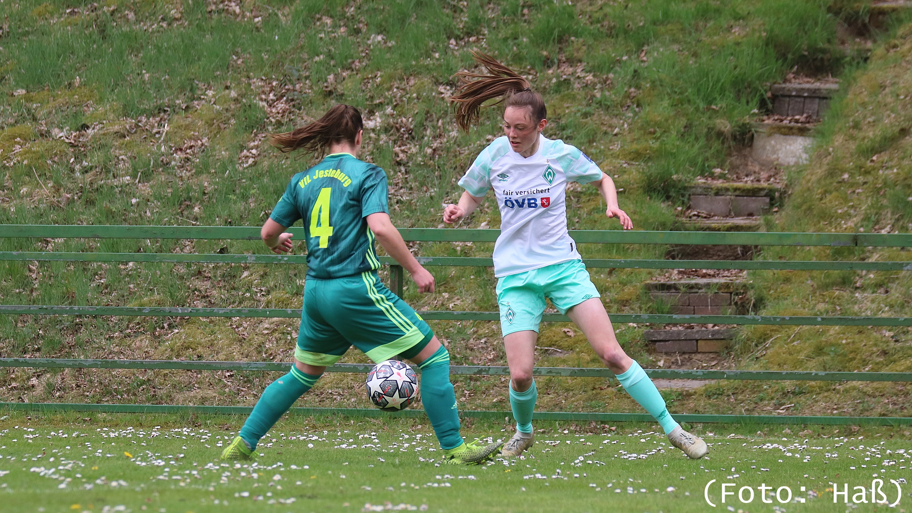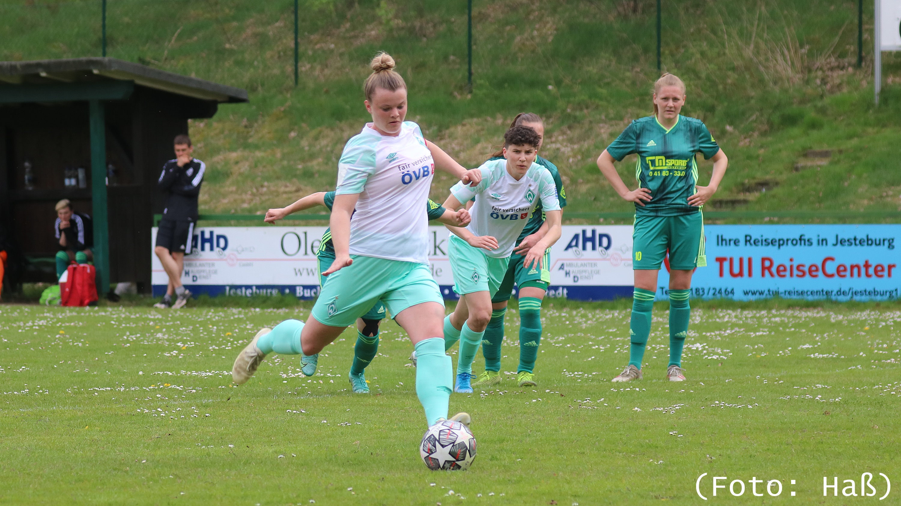 Werder Bremen war in dieser Begegnung das spielbestimmende Team und gingen in der 12. Minute durch Alina Böttjer in Führung. Zuvor ahndete die Unparteiische ein Handspiel im Strafraum und zeigte folgerichtig auf dem Punkt. Nur wenig später in der 15. Minute nutzten die Gastgeberinnen eine Unaufmerksamkeit der Hintermannschaft und glich aus. Danach war zwar Werder spielbestimmend, ohne dabei zwingend zu sein.