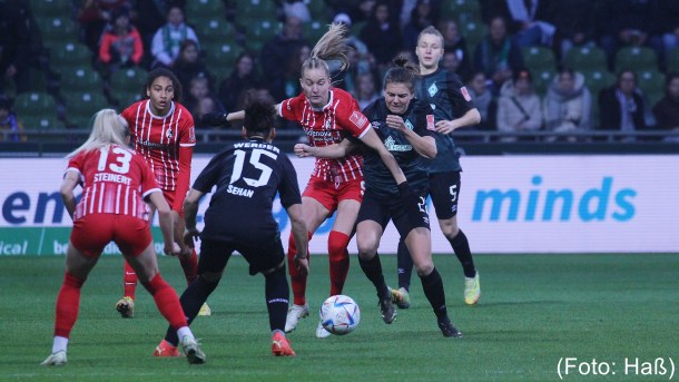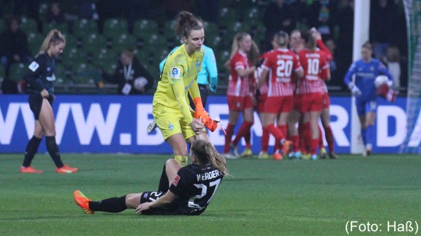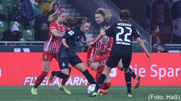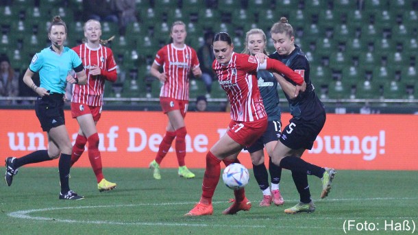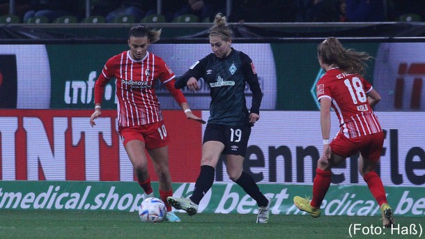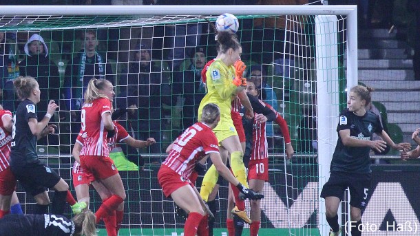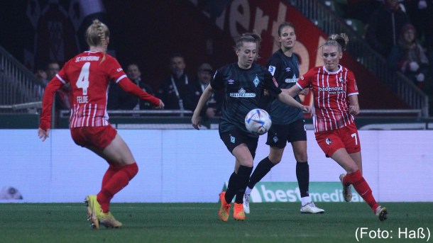 Zum Spiel: Mit viel Applaus wurden die Spielerinnen empfangen und die Grün-Weißen erwischten dabei den besseren Start. Dabei drückte Werder die Gäste in ihrer eigenen Hälfte, ohne dabei zu klaren Torchancen zu kommen. In der 26. Minute glückte Nina Lührßen jedoch ein Geniestreich, als sie einen direkten Freistoß aus spitzem Winkel unter die Latte schlenzte. Ein Gänsehautmoment, wo sie als erste Torschützin im Weserstadion Geschichte schrieb. Danach kamen die Gäste aus dem Breisgau besser ins Spiel und kurz vor der Halbzeitpause konnte Freiburg durch Janina Minge (43.) den Ausgleichtreffer erzielen.
