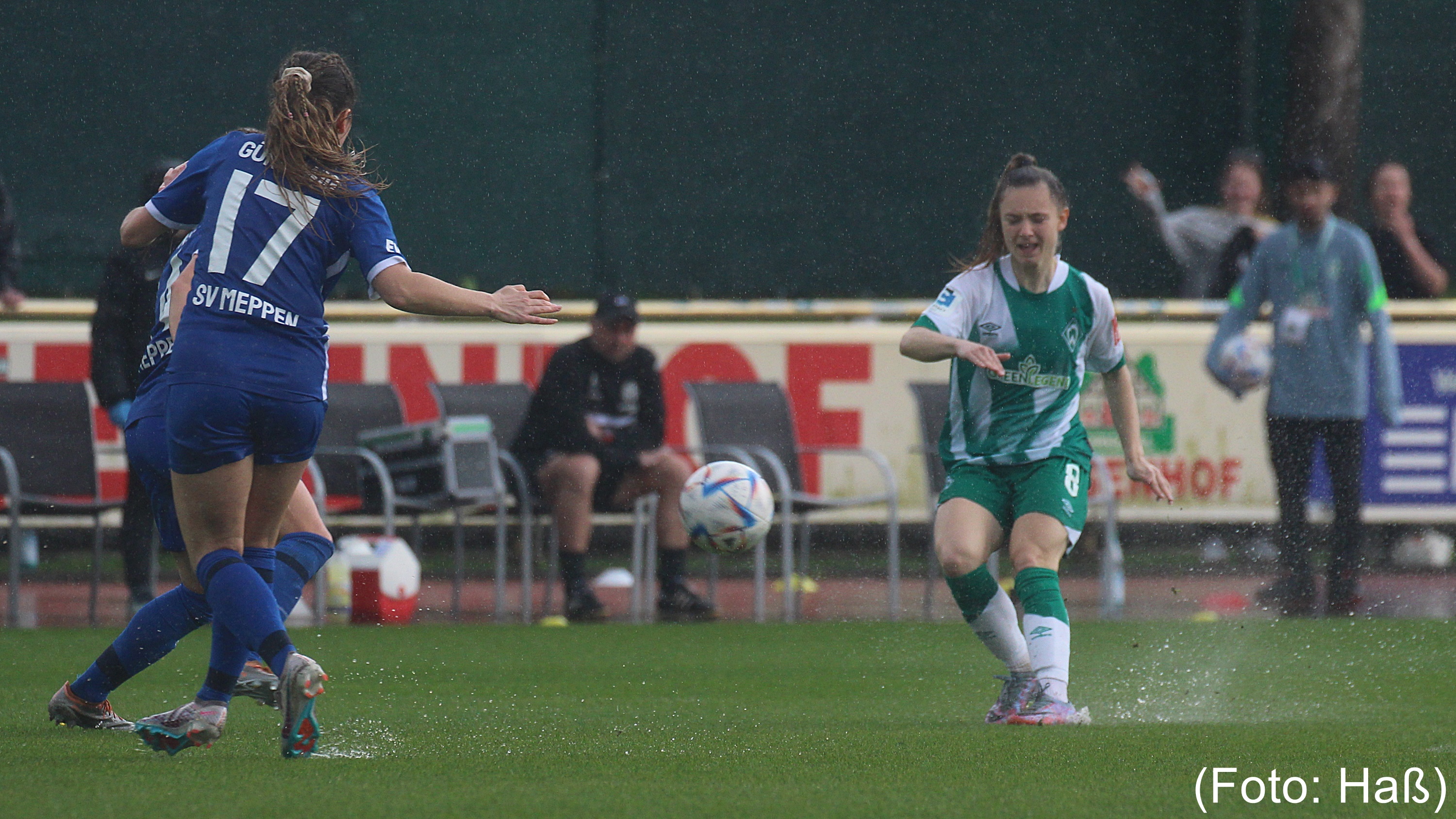 Ein Gewitter kurz nach Wiederanpfiff unterbrach die Begegnung für ca. 10 Minuten. Passend dazu wurde in der Zwangspause auch das Lied „Singing in the rain“ gespielt. So sind wir Bremer*Innen eben, kennen wir doch das Regenwetter zu genüge. Unter erschwerten Platzverhältnissen versuchten die Bremerinnen das entscheidende Tor zu erzielen, doch gute Möglichkeiten von Saskia Matheis (57.) und eine abgefälschte Flanke von Jasmin Sehan (73.) fanden nicht das Ziel. Die beste Möglichkeit hatte Chiara Hahn in der 85. Minute, als sie freistehend vor Meppens Tor und Keeperin, den Ball leider nicht gut genug platzieren konnte und dieser über das Tor ging. In der 90+2. versuchte es dann noch die eingewechselte Stefanie Sanders frei vor Meppens Tor, jedoch aus spitzem Winkel, den Siegtreffer zu erzielen. Meppens Keeperin Sieger war jedoch zur Stelle.