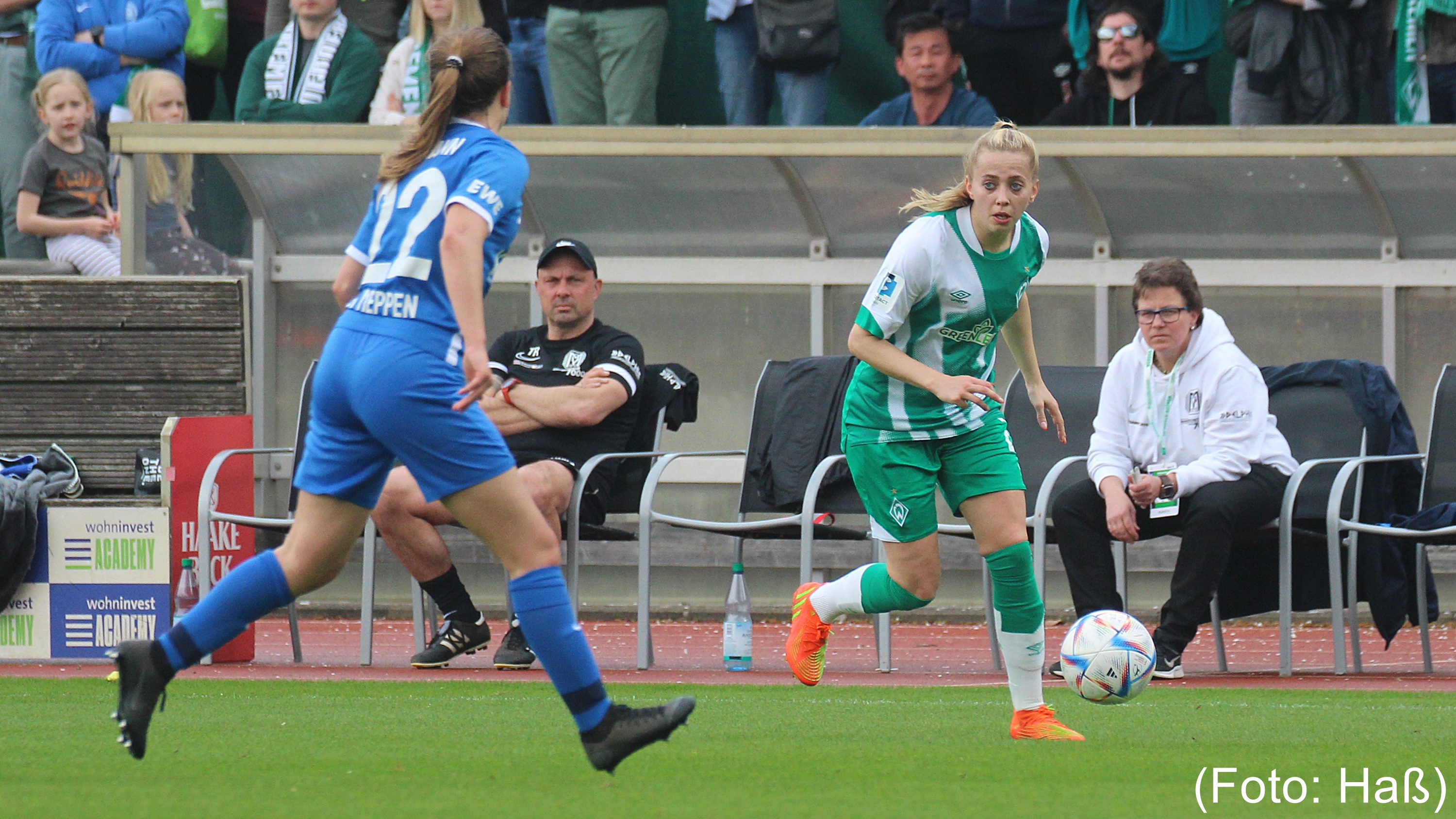 In Halbzeit 1 kamen die Grün-Weißen gut in die Partie und sie hatten durch Nina Lührßen (7.) die erste Möglichkeit. Ihr Abschluss konnte jedoch per Kopf geklärt werden. Im Gegenzug dann einmal durchatmen, als die ehemalige Werderanerin Lisa Josten freistehend vor Werders Tor das leere Tor nicht traf und den Ball nur einem Meter vor dem Tor an die Latte setzte. Danach waren dann die Gäste druckvoller und Bathmann (22.) und wieder Josten (23.) vergaben gute Einschussmöglichkeiten. In dieser Phase wirkte die Abwehr des SV Werder Bremen leider etwas unsortiert. Diese fing sich jedoch wieder mit zunehmender Unterstützung der Werder-Fans, die zu dem Zweitpunkt spürten, dass ihre Lieblingsmannschaft aufgebaut werden musste. Kurz danach zappelte in der 25. Minute der Ball dann im Meppener Tor, dieser fand jedoch berechtigt keine Anerkennung, ging zuvor ein Handspiel durch Werders Verteidigerin Hanna Nemeth voraus. Gute Einschuss Möglichkeiten hatten noch Chiara Hahn, die lange aufgrund einer grippebedingten Pause wieder in der Startelf stand. Ihr Kopfball fand in der 27. Minute nicht das gewünschte Ziel. Auch Nina Lührßen konnte in der 31. Minute mit ihrem Abschluss die Werder-Frauen nicht in Führung bringen.