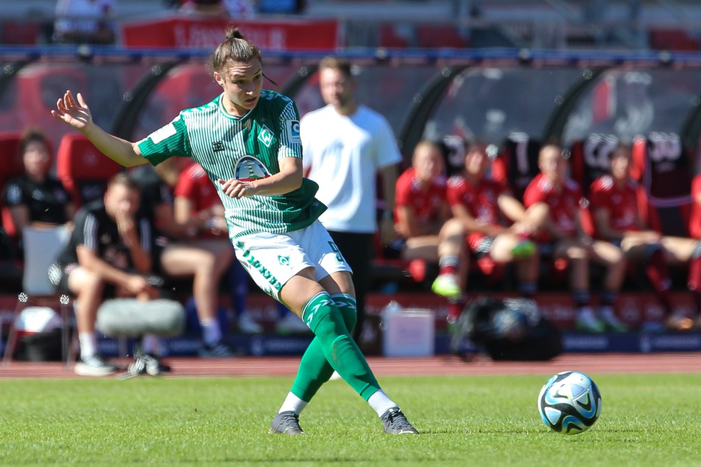 Die Werder Frauen waren gleich zu Beginn das bessere Team und hatten in der 8. Minute durch Lisa Josten auch die erste Einschussmöglichkeit. Aus spitzem Winkel verpasste sie nur knapp den Führungstreffer. In der 17. Minute dann der Schock: Nach einem Standard nutzte Nürnbergs Franziska Mai die Unordnung im Werder-Strafraum und brachte die Gastgeberinnen in Führung. Das Team um Kapitänin Lina Hausicke tat sich nach dem Rückstand zunächst schwer und Nürnberg hatte auch gute Kontermöglichkeiten, die sie entweder nicht gut zu Ende ausspielten oder an der kompakt stehenden Verteidigungskette um Abwehrchefin Michelle Ulbrich scheiterten. Im letzten Drittel der ersten Halbzeit kamen die Grün-Weißen wieder besser ins Spiel und konnten kurz vor der Halbzeitpause (41.) durch Sophie Weidauer zum 1:1 ausgleichen. Eine passgenaue Flanke von Nina Lührßen musste sie nur noch freistehend ins Tor einköpfen.
