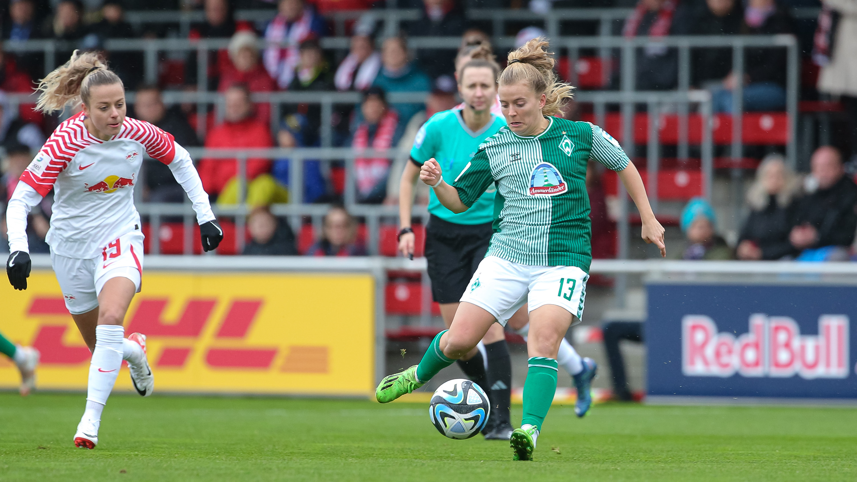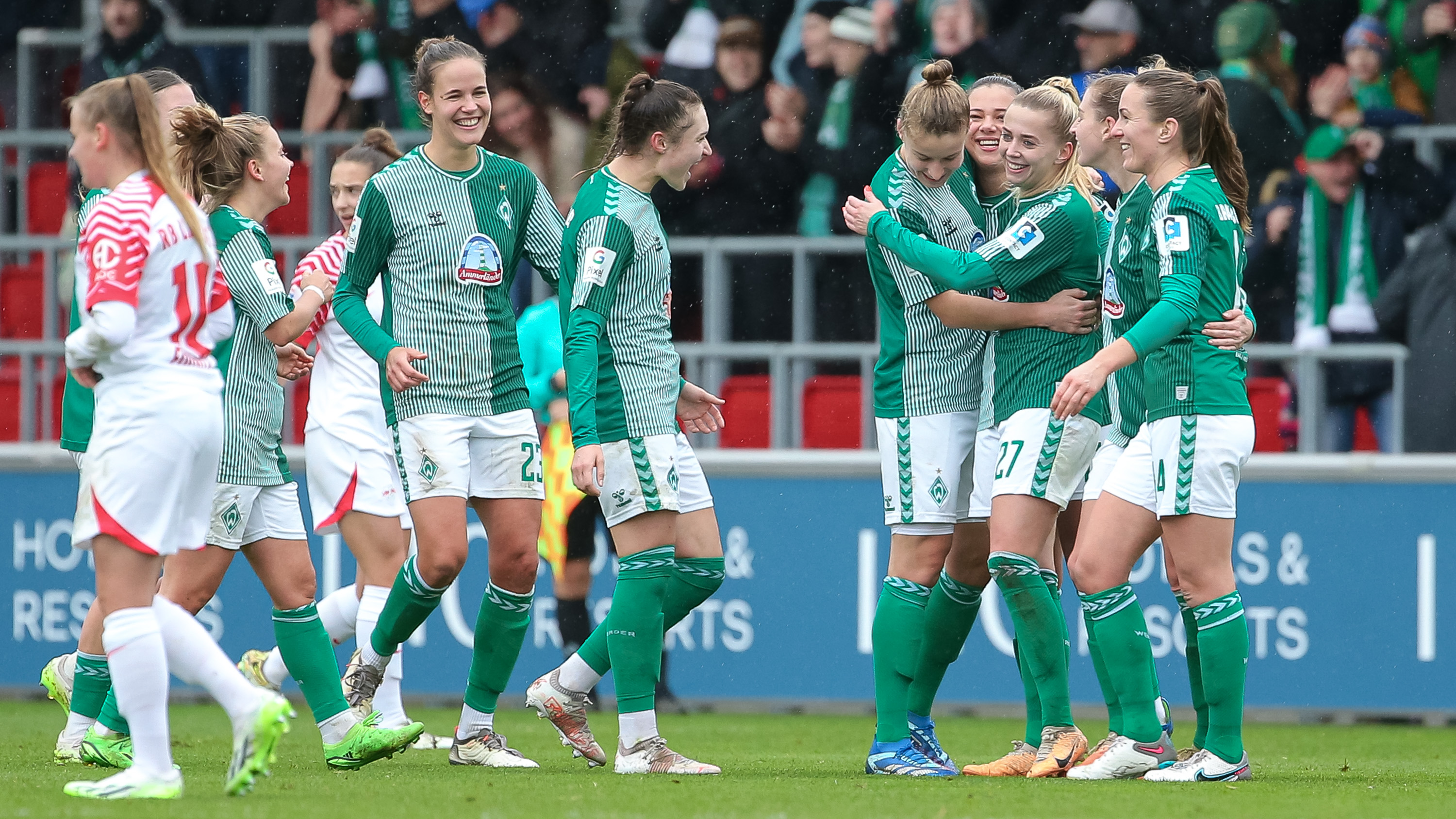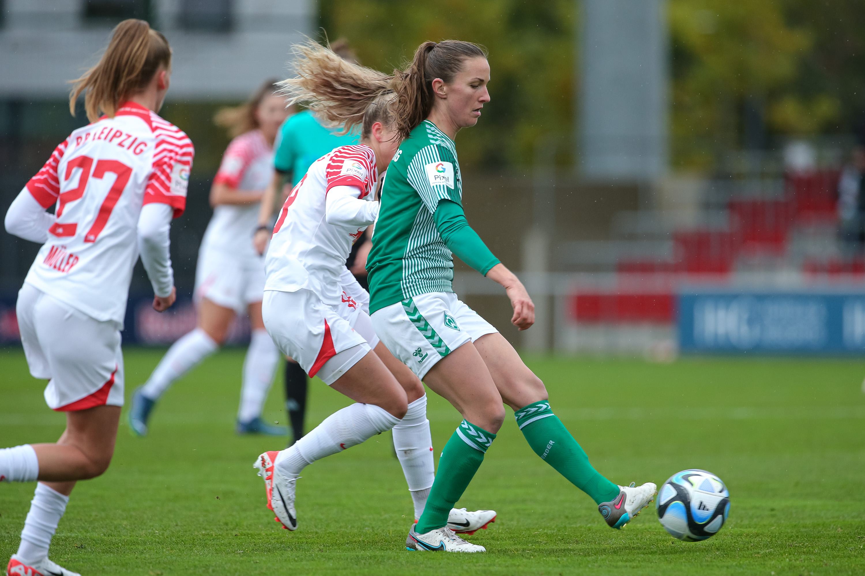 Kaum angepfiffen, da zappelte der Ball schon im Netz der Leipzigerinnen. Ein missglückter Befreiungsschlag der Leipziger Keeperin Elvira Herzog landete vor den Füßen von Saskia Matheis. Diese hob kurz den Kopf und lupfte den Ball über die Keeperin ins Tor zur 1:0-Führung nach etwas mehr als einer Minute. Auch danach bestimmte Werder die Begegnung, und in der 31. Minute erhöhte Sophie Weidauer auf 2:0. Und das sollte es bis zur Halbzeit nicht gewesen sein. In der 40. Minute erhöhte Nina Lührßen per direktem Freistoß sehenswert zum 3:0.
