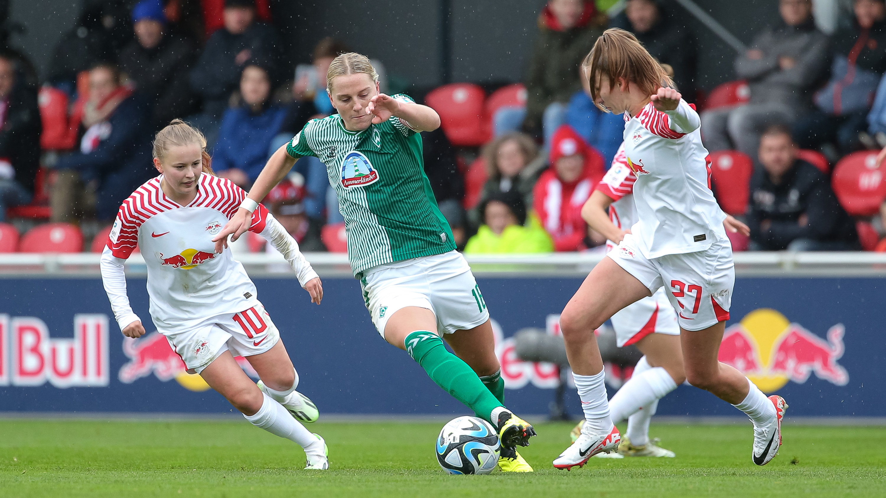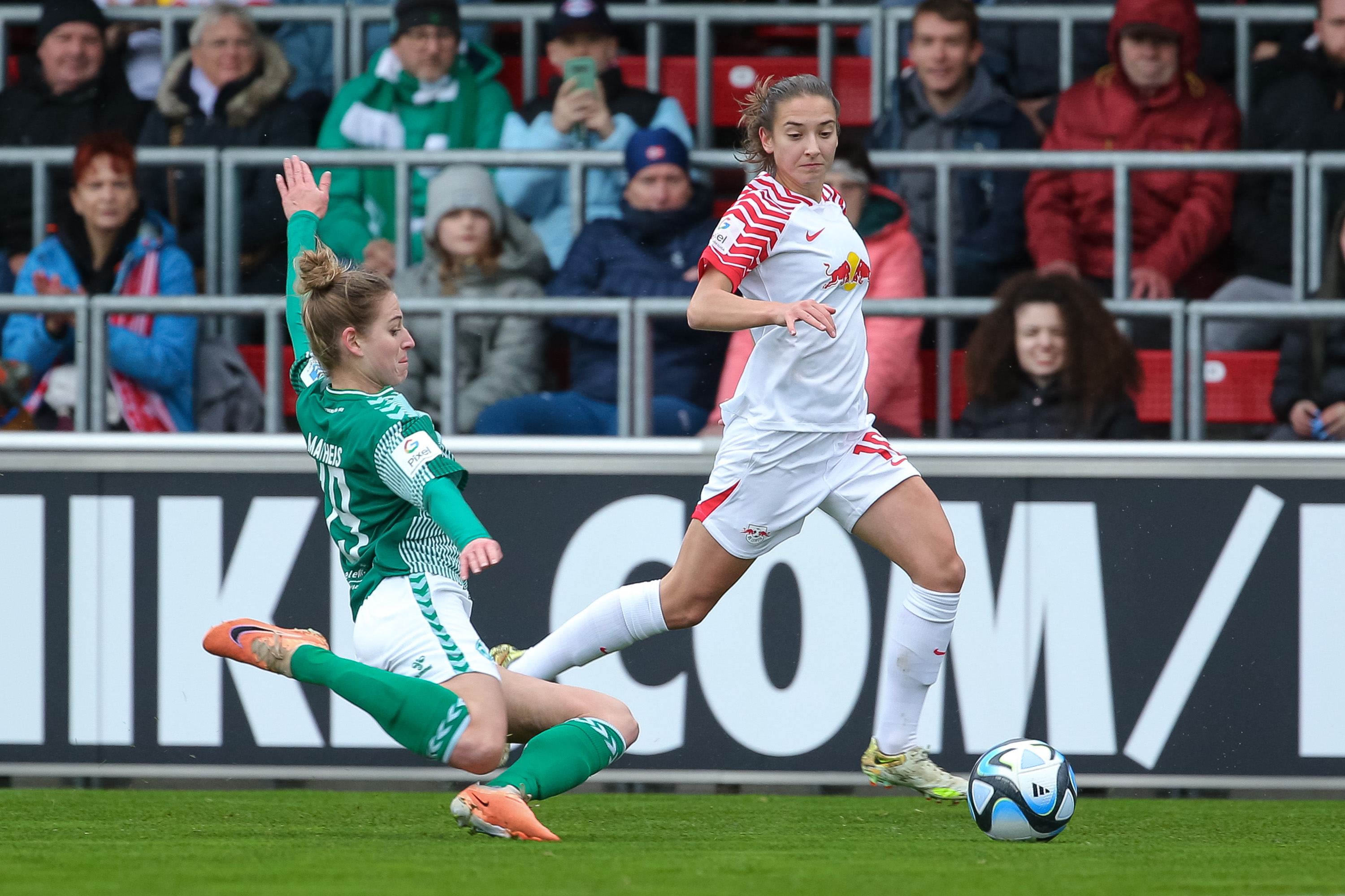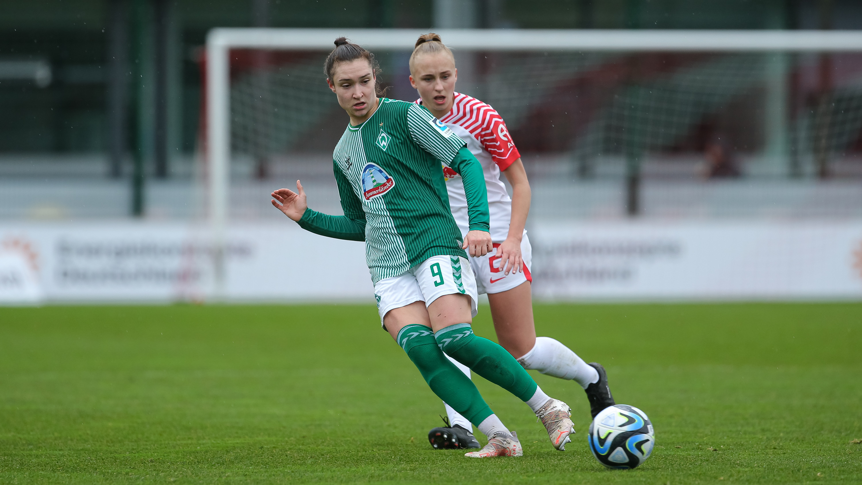 Kaum angepfiffen, da zappelte der Ball schon im Netz der Leipzigerinnen. Ein missglückter Befreiungsschlag der Leipziger Keeperin Elvira Herzog landete vor den Füßen von Saskia Matheis. Diese hob kurz den Kopf und lupfte den Ball über die Keeperin ins Tor zur 1:0-Führung nach etwas mehr als einer Minute. Auch danach bestimmte Werder die Begegnung, und in der 31. Minute erhöhte Sophie Weidauer auf 2:0. Und das sollte es bis zur Halbzeit nicht gewesen sein. In der 40. Minute erhöhte Nina Lührßen per direktem Freistoß sehenswert zum 3:0.