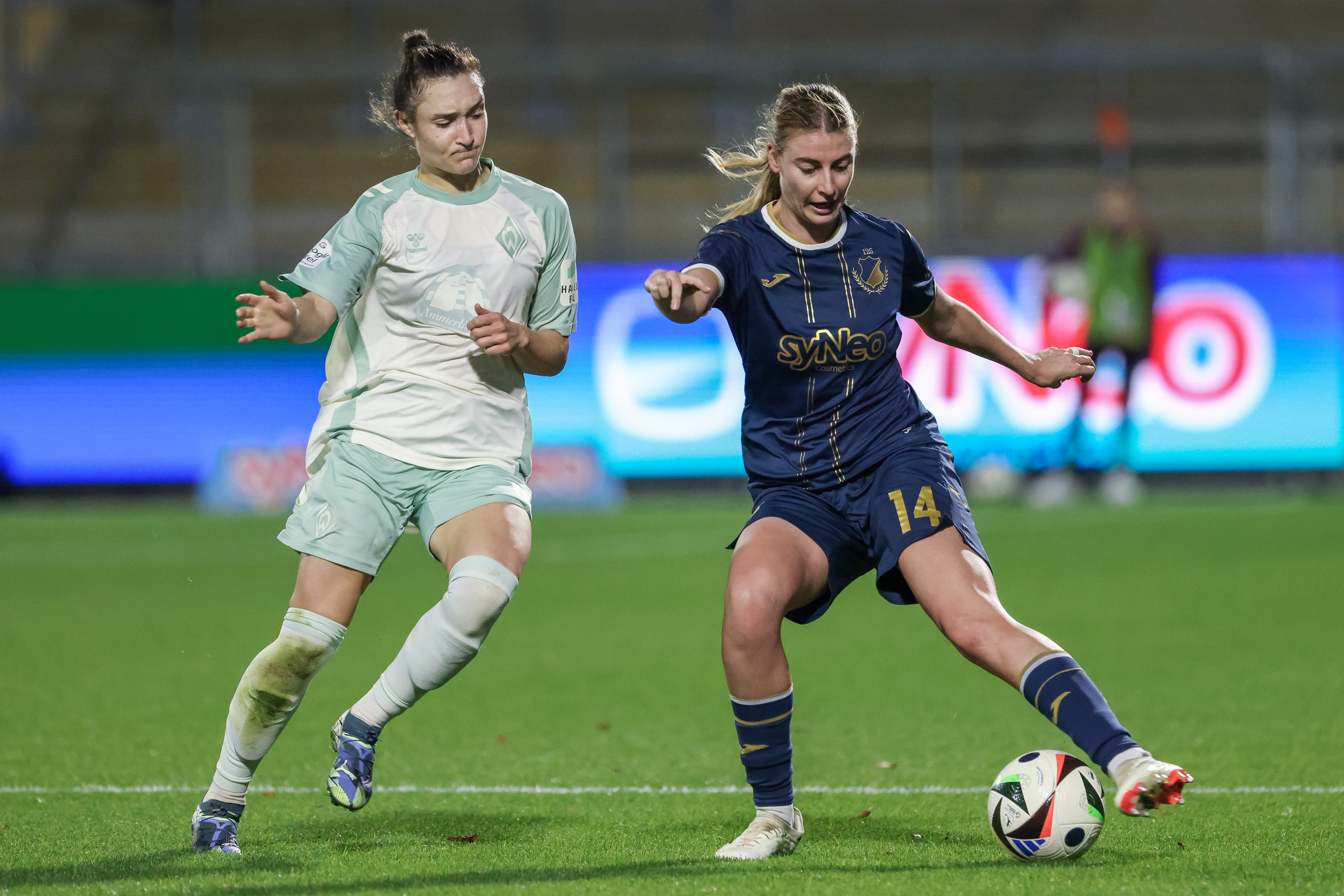 In der 1. Halbzeit spielte das Spiel vornehmlich im Mittelfeld ab, wo beide Teams im Spielaufbau eher verhalten und gemächlich agierten. So führte ein Standard in der 31. Minute zur Führung für die Gastgeberinnen, da die Abwehr von Werder Bremen ein wenig unsortiert war. Memeti brachte den Freistoß gut in den Sechzehner, wo Cazella völlig frei stand und den Ball unhaltbar unter die Latte wuchtete.