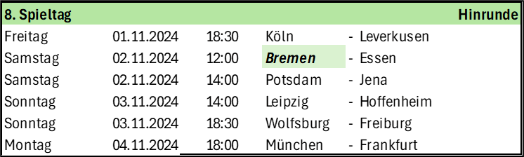 Für Werder Bremen verlief die Saison bislang ebenfalls wechselhaft. Mit 8 Punkten stehen sie momentan auf dem achten Tabellenplatz. Die großen Herausforderungen haben sie jedoch bereits hinter sich gebracht und dabei auf sich aufmerksam gemacht. Zum Saisonstart holten sie ein bemerkenswertes 3:3 gegen Wolfsburg und gewannen glanzlos 2:0 gegen Potsdam. Ein kleiner Negativlauf folgte mit Niederlagen in Leipzig (0:2), gegen Bayern München (0:4) und in Hoffenheim (0:1). Danach gelang ihnen ein 1:1 in einem spannenden Spiel gegen Leverkusen im Weserstadion, gefolgt von einem überraschenden 1:0-Sieg bei Eintracht Frankfurt, die bis dahin ungeschlagen waren.