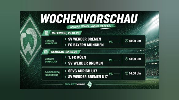 Damit wartet auf die Werder-Teams eine Woche mit drei spannenden Aufgaben. Wir wünschen allen grün-weißen Mannschaften viel Erfolg und hoffen auf viele gute Momente in Grün-Weiß.