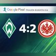 Was für ein Nachmittag auf Platz 11. Die Werder-Frauen drehen gegen Eintracht Frankfurt einen 0:2-Rückstand und gewinnen am Ende verdient mit 4:2. Zwei Traumtore von Larissa Mühlhaus bringen Werder zurück ins Spiel, bevor Mara Alber und Medina Dešić den Heimsieg vor 1632 Zuschauer*innen perfekt machen.